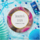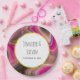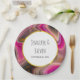Hochzeitspapier-Teller mit einem groovy aussehenden abstrakten Design. Rosa und schwarze Farben mischen sich und vermischen sich in einer wirbelnden Bewegung. Sprinklen von Imitaten goldener Glitzer zwischen den Schichten. Ein weißer Rahmen mit Imitaten mit goldener Folie, oben mit personalisiertem Text.