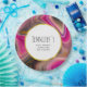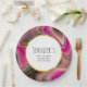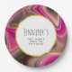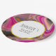 Baby Duschpapier Teller mit einem groovy aussehenden abstrakten Design. Rosa und schwarze Farben mischen sich und vermischen sich in einer wirbelnden Bewegung. Sprinklen von Imitaten goldener Glitzer zwischen den Schichten. Ein weißer Rahmen mit einem goldenen Rahmen aus Imitaten, oben mit dem personalisierten Text überlegt.