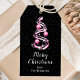 Dieses elegante und schicke Geschenketikett kann mit Ihrem Familiennamen personalisiert werden. Das Design ist mit einem rosa und schwarzen Band Weihnachtsbaum mit Baubles ausgestattet. Der Text kombiniert handgeschriebene Skripte mit modernen serifenlosen Schriftart für ein elegantes und raffiniertes Aussehen. Der fallende Schnee, Schneeflocken und Glitzern geben eine festliche und magische Touch. Das ist ideal für Geschenke und Gastgeschenke.