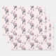 Umhüllungspapier mit Aquarellbild. 2 rosa und schwarze Vögel, die auf einem Baumzweig mit rosa Blüten sitzen.