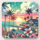 Strandkunst in aquamarin, rosa und türkisfarben mit einem Comic im Stil eines Pops. Palmen, Strandhaus, tropische Blume und ein herrlicher Sonnenuntergang.