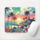 Strandkunst in aquamarin, rosa und türkisfarben mit einem Comic im Stil eines Pops. Palmen, Strandhaus, tropische Blume und ein herrlicher Sonnenuntergang.