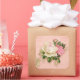 Sticker mit Blumenstrauß mit weißen und rosa Blume. Der Hintergrund ist rosa mit einem Blumenmuster. Hübsches und elegantes Design.