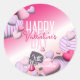 Personalisierte Valentinstag Aufkleber mit rosa, rosa und weiß gestreiften, herzförmigen Ballons auf rosa Farbverlauf. Der Text ist vollständig anpassbar. Um es zu ändern, verwenden Sie die Option Personalize. Weitere Änderungen, z. B. Änderungen am Schriftart, am Schriftart oder am Textlayout, können Sie mit der Option Design bearbeiten durchführen.