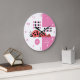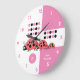 Die rosa und weiße Uhr mit niedlichen roten und schwarzen Ladybirds, für ein Kinderzimmer, für ein Kinderzimmer-Dekor. Personalisieren mit einem Namen. Geschenkidee.