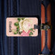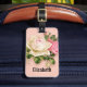 Gepäckanhänger mit Blumenstrauß mit weißer und rosa Blume. Der Hintergrund ist rosa mit einem Blumenmuster. Hübsches und elegantes Design.