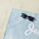Dieses Badetuch verfügt über einen Poolbereich mit einem in Rosa und Weiß gestreiften Regenschirm und zwei Liegestühlen. Dieses Design kann mit einem Namen personalisiert werden, indem Sie auf "Diese Vorlage personalisieren" klicken.