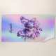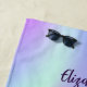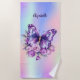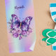 Holografischer Hintergrund in Rosa, lila und Minzgrün. Die Einrichtung ist mit einem lila Schmetterling, rosa und violetten Blumen geschmückt. Personalisieren Sie Ihren Namen und fügen Sie ihn hinzu.