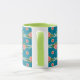 Eine wunderschöne, weiße Ringer-Tasse mit einer grünen Lippe und einem Handgelenk und einem Muster von Wasserlilien und Libellen, aus einer handbemalten Papiercollage von Judy Adamson. Ein wunderschönes Geschenk für jemanden mit einem Geburtstag im Juli; Teil der Posh & Painterly 'Lily Pond' Kollektion.