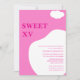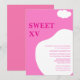 Das Design zeigt eine individuelle Quinceanera Einladung in Rosa und Weiß. Ein "SWEET XV"-Text auf verlassen Seite in fett gedruckter Typografie. Das Design ist einzigartig und farbenfroh und wird ein außergewöhnliches Element für Ihre kleine Prinzessin sein.