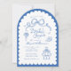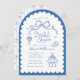 Einladung zur Brautdusche in dunkelblau und weiß. Ein trendiger Stil mit niedlichen Bowdoodles, gestapelten Cocktailbrillen, Blume und High Heels, gepaart mit skurrilen und lustigen handgeschriebenen Schriftart auf einem geschmiedeten Bogenhintergrund. Die Rückseite der Karte hat ein koordinierendes, durchgehendes Bogen-Muster, kann aber gelöscht werden. Alle Farben können von Ihnen bearbeitet werden! © Kimbellished, LLC