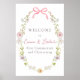 Herzlich willkommen in Ihrer Gemeinde mit diesem schönen Schild mit einem Kranz von Wildblumen. Fügen Sie den Ehrengast mit dem Namen, dem Duschdatum und dem persönlichen Willkommenstext unter Verwendung der angegebenen Felder hinzu.
