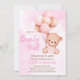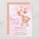 Eine Babydusche "wir können frühzeitig warten" Einladung mit einem niedlichen Baby Teddy Bär und weichen pastellbraunen und rosa Ballons .