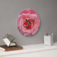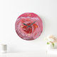 Rosa, Rot und Rose farbige Cartoonblumenblätter sind der Hintergrund für gelbe Uhrziffern.