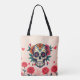 Ein charmanter Totenbeutel mit einem Zuckerschädel-Design auf einem sanften, hellrosa Hintergrund mit feinen Rose. Diese Tasche verbindet edgy Schädelkunst mit einer Touch von blumengeschmückter Eleganz und ist somit ideal für diejenigen, die mutige, aber weibliche Stile Liebe.