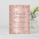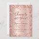 Feiern Sie stilvoll mit diesem modernen Rose Gold Glitzer "Cheers to 60 Years" Geburtstagseinladung. Dieses elegante und feminine Design besticht durch glänzende Details in der Rose mit vergoldeten Glitzer, eine anmutige Swash Schwanz Kalligraphie-Skript und einen sanften, rot-rosa metallischen Hintergrund. Ideal für eine glamouröse 60. Geburtstagsfeier oder ein Meilenstein - leicht anpassbar für eine 30., 40., 50., 70. oder sogar 80. Geburtstagsfeier.