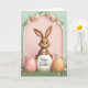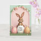 This card shows a brown rabbit with bright blue eyes and a soft, friendly smile, posed in the center as if pausing to greet someone special 🐰. The rabbit sits inside a pale pink arched niche, framed by a rose garland in light pink and creamy white with leafy green accents that feels like a gentle embrace. Below, three smooth eggs rest in deep green grass, arranged close together like a small trio sharing a quiet moment. The middle egg is white and carries the words “Happy Easter” across its front in thin, flowing lettering, set in a dark tone that stands out clearly. On either side, one egg is blush pink and the other is warm beige, keeping the palette soft and springlike 🌷. Tiny star-shaped flowers in white and pale pink scatter across the foreground and also drift lightly in the background, adding a sweet, companionable touch to the scene. A soft mint-green backdrop and diffused lighting give the whole design a calm, dreamy look. The roses curve neatly around the arch while small blossoms dot the grass near the eggs.
