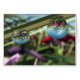 Eine computergenerierte 3D-Schließung in Vue, die sich auf Regentropfen konzentriert, die eine Grashalde in einem Feld von Blume abtropfen. Die unscharfen Grundierungen in Rot, Gelb und Lavendel im Hintergrund spiegeln sich deutlich in den Wassertropfen wider.