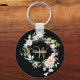Hübscher Monogramm-Schlüsselanhänger mit einem schönen weißen Skriptnamen mit einem vergoldeten Initial, der durch eine zarte Aquarellgarland mit blühender Rose auf schwarzem Hintergrund gerahmt ist. Personalisieren Sie sich, um ein besonderes Geschenk zu erhalten! Entwickelt von Thisisnotme©