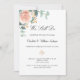 Ein schick weißer Hintergrund. Dekoriert mit einer Rose Gold und rot rosa Blumen, Rose Blume und grüne Aquarell Eukalyptus Blätter, Sprigs, Grün und ein Imitat goldbraun. Personalisieren und fügen Sie Ihre Namen und die Details. Schwarz-Grün-Buchstaben.