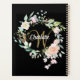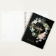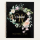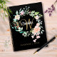 Hübscher Monografie-2023-Planer mit einem schönen weißen Skriptnamen mit einem vergoldeten Initial, der durch eine zarte Aquarellgarland mit blühender Rose auf schwarzem Hintergrund gerahmt ist. Entwickelt von Thisisnotme©