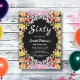 Diese elegante Blumengeburteinladung eignet sich perfekt für einen modernen Blumengeburtstag im Sommer. Das romantische Design besticht durch einen farbenfrohen Blumenkranz mit eleganter weißer Typografie auf schwarzem Hintergrund.