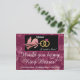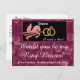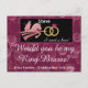 Ein schöner Ritter in glänzender und glitzernder Rüstung bereit, die Ringe in Braut und Bräutigam zu bringen. Die Karte zeigt den Ritter auf seinem Pferd, das eine Lanze hält und auf die goldenen Ringe zeigt. Der Hintergrund hat große Rose Champagner-Bläschen und einen bordeauxroten Hintergrund. Sie können die Nachricht hinter der Karte bearbeiten oder die Wörter behalten. Es ist bereit, gepostet zu werden.