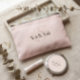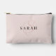 This cute personalized bridesmaid name cosmetic pouch features personalized bridesmaid's name, calligraphy monogram in light pink color, and custom message at the back side of the pouch. Change background and fonts colors easily if you like.