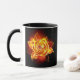 Blühende Rose aus Feuer und Flamme auf schwarzem Hintergrund.