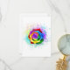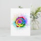 Große, blühende Rose mit Regenbogenblüten auf weißem Hintergrund, überstrichen mit farbenfrohen, hellen Farbtupfern. 3d