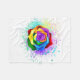 Große, blühende Rose mit Regenbogenblüten auf weißem Hintergrund, überstrichen mit farbenfrohen, hellen Farbtupfern. 3d