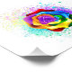 Große, blühende Rose mit Regenbogenblüten auf weißem Hintergrund, überstrichen mit farbenfrohen, hellen Farbtupfern. 3d