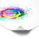 Große, blühende Rose mit Regenbogenblüten auf weißem Hintergrund, überstrichen mit farbenfrohen, hellen Farbtupfern. 3d