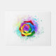 Große, blühende Rose mit Regenbogenblüten auf weißem Hintergrund, überstrichen mit farbenfrohen, hellen Farbtupfern. 3d
