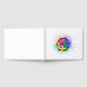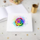 Große, blühende Rose mit Regenbogenblüten auf weißem Hintergrund, überstrichen mit farbenfrohen, hellen Farbtupfern. 3d