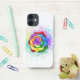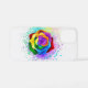 Große, blühende Rose mit Regenbogenblüten auf weißem Hintergrund, überstrichen mit farbenfrohen, hellen Farbtupfern. 3d