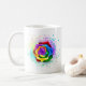 Große, blühende Rose mit Regenbogenblüten auf weißem Hintergrund, überstrichen mit farbenfrohen, hellen Farbtupfern. 3d