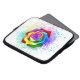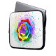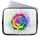 Große, blühende Rose mit Regenbogenblüten auf weißem Hintergrund, überstrichen mit farbenfrohen, hellen Farbtupfern. 3d