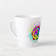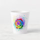 Große, blühende Rose mit Regenbogenblüten auf weißem Hintergrund, überstrichen mit farbenfrohen, hellen Farbtupfern. 3d