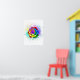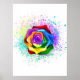 Große, blühende Rose mit Regenbogenblüten auf weißem Hintergrund, überstrichen mit farbenfrohen, hellen Farbtupfern. 3d