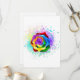 Große, blühende Rose mit Regenbogenblüten auf weißem Hintergrund, überstrichen mit farbenfrohen, hellen Farbtupfern. 3d