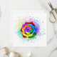 Große, blühende Rose mit Regenbogenblüten auf weißem Hintergrund, überstrichen mit farbenfrohen, hellen Farbtupfern. 3d