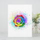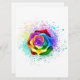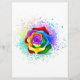 Große, blühende Rose mit Regenbogenblüten auf weißem Hintergrund, überstrichen mit farbenfrohen, hellen Farbtupfern. 3d