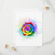 Große, blühende Rose mit Regenbogenblüten auf weißem Hintergrund, überstrichen mit farbenfrohen, hellen Farbtupfern. 3d