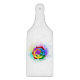 Große, blühende Rose mit Regenbogenblüten auf weißem Hintergrund, überstrichen mit farbenfrohen, hellen Farbtupfern. 3d