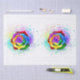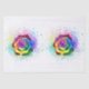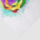 Große, blühende Rose mit Regenbogenblüten auf weißem Hintergrund, überstrichen mit farbenfrohen, hellen Farbtupfern. 3d