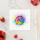 Große, blühende Rose mit Regenbogenblüten auf weißem Hintergrund, überstrichen mit farbenfrohen, hellen Farbtupfern. 3d