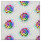 Große, blühende Rose mit Regenbogenblüten auf weißem Hintergrund, überstrichen mit farbenfrohen, hellen Farbtupfern. 3d