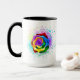 Große, blühende Rose mit Regenbogenblüten auf weißem Hintergrund, überstrichen mit farbenfrohen, hellen Farbtupfern. 3d