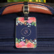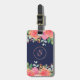 Dieses Gepäckschild zeichnet sich durch ein modernes Aquarell-Blumendesign mit rosa und korallenfarbenen Rose, Blattwerk und Imitat Rose Gold Glitzer auf einem marineblauen Hintergrund aus. Personalisieren Sie das Monogramm mit Ihrem Initial und fügen Sie Ihren Kontakttext auf der Rückseite ein.